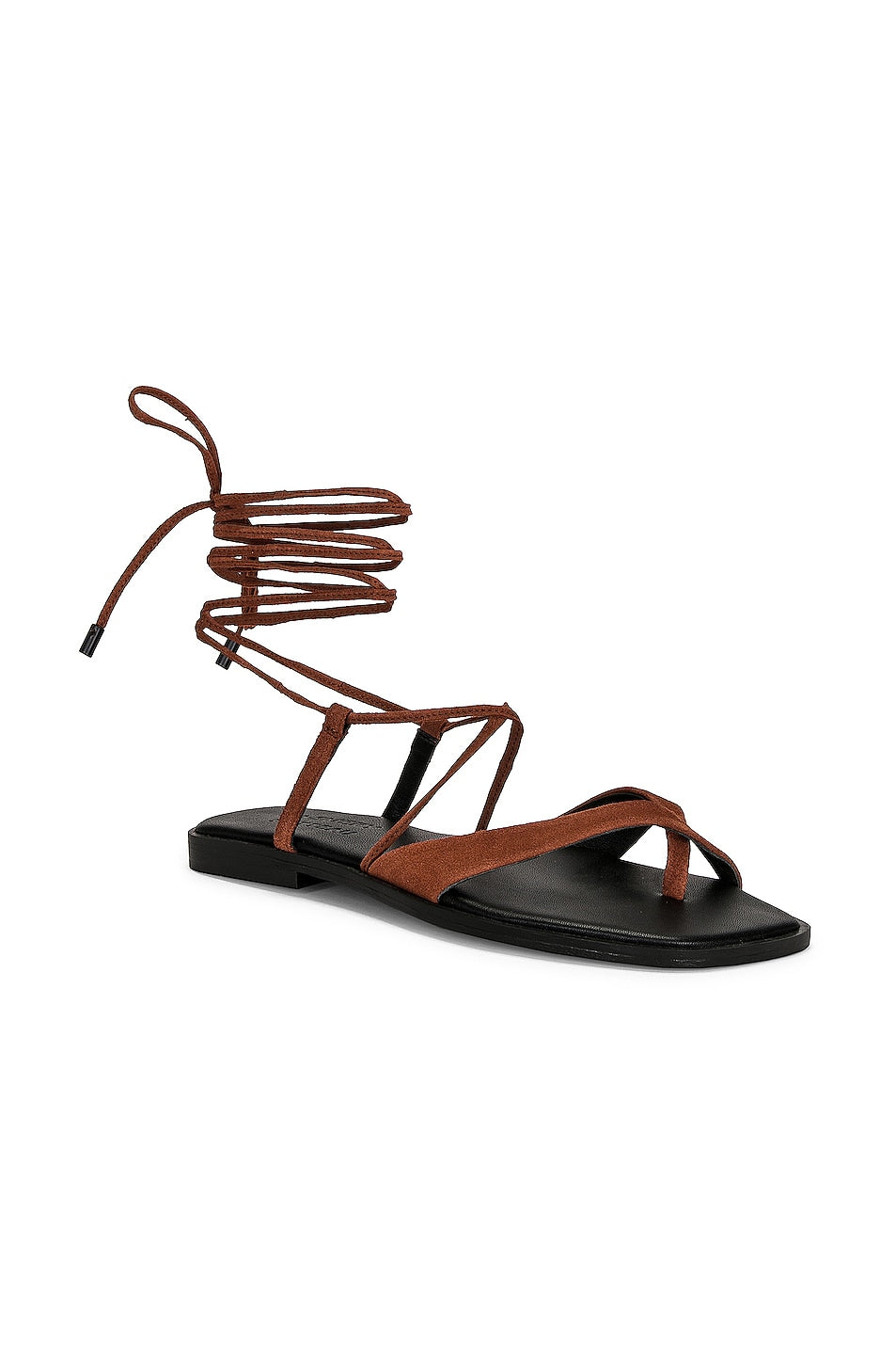 The Deia sandal features a criss-cross toe hold paired with thin tubular straps that cross the front of the ankle before transitioning into an ankle tie, sitting atop a lightly padded footbed.