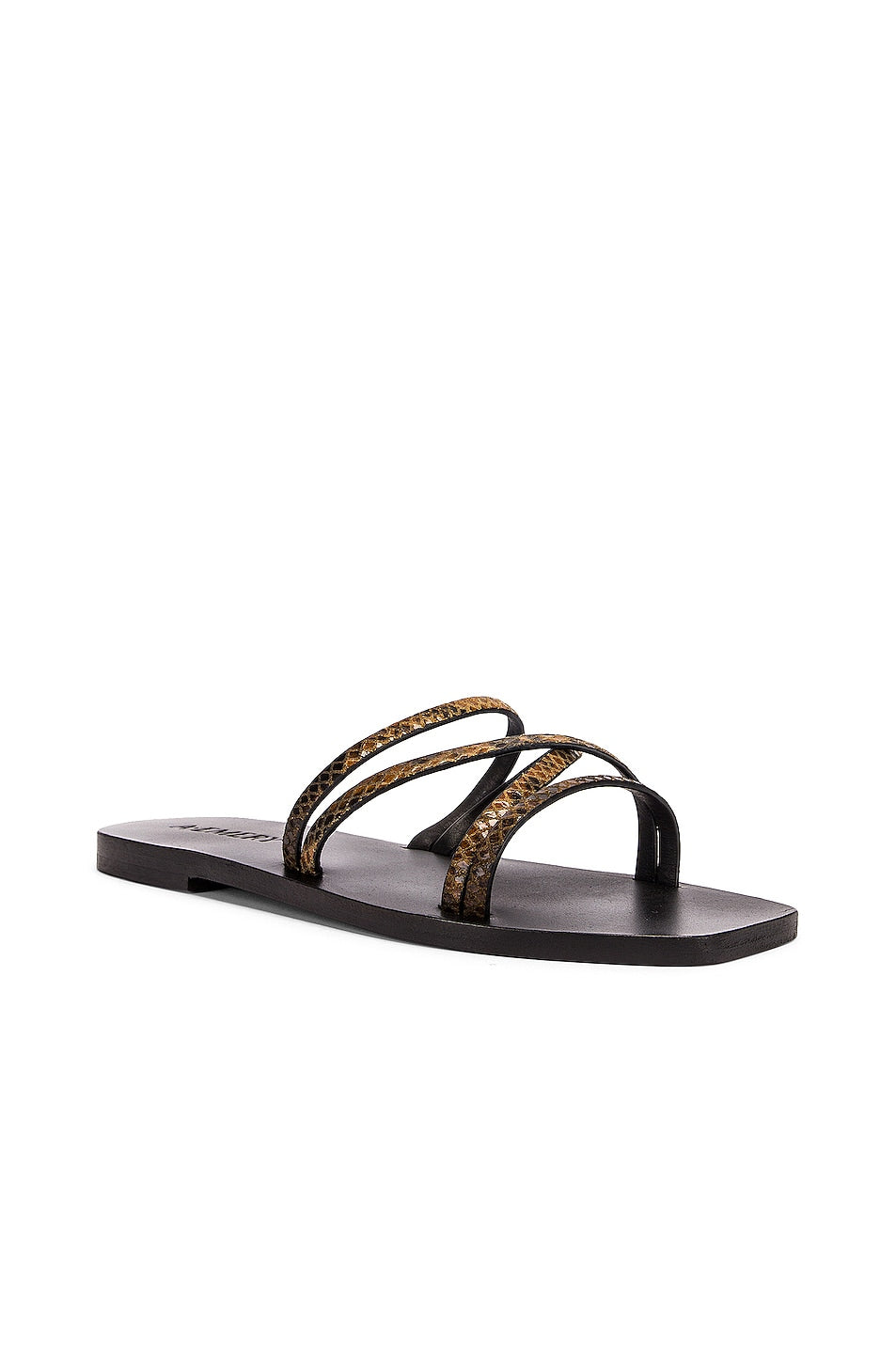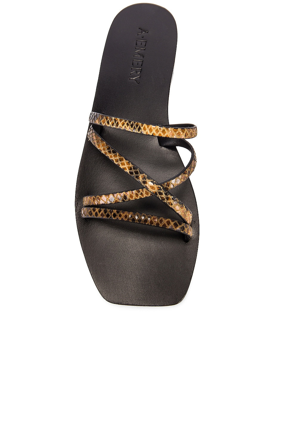 The A.EMERY Riley Sandal in Caramel Snake features a snake-embossed leather upper, leather sole, and rubber tap heel. Designed in Melbourne and handcrafted in India for understated versatility.