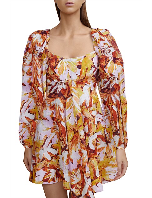 Oliver Dress by Acler (AS2204118D‑PRT‑EXC) is cut from a lightweight viscose‑blend in a Lilac Brush print, featuring a scooped neckline and fitted bodice for an elegant silhouette.