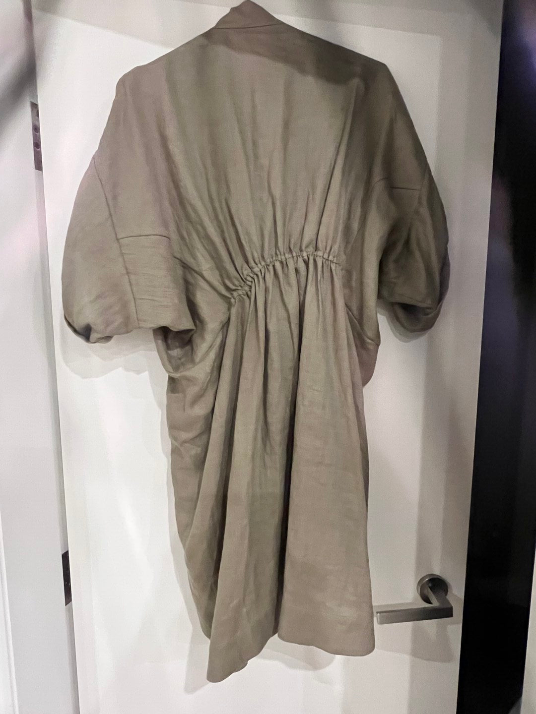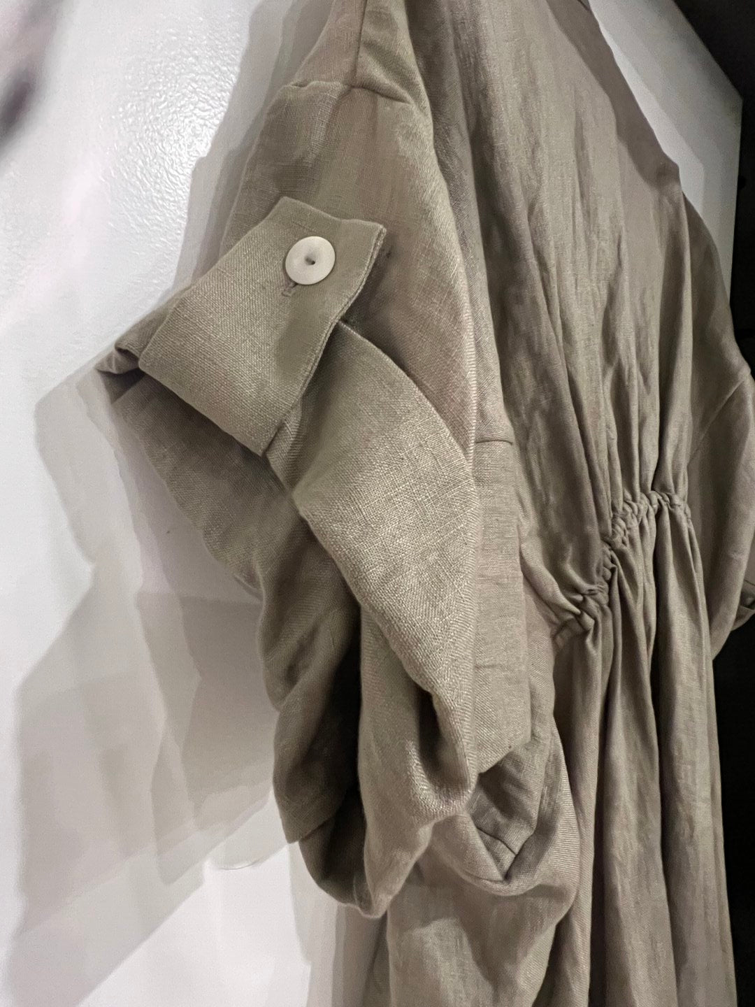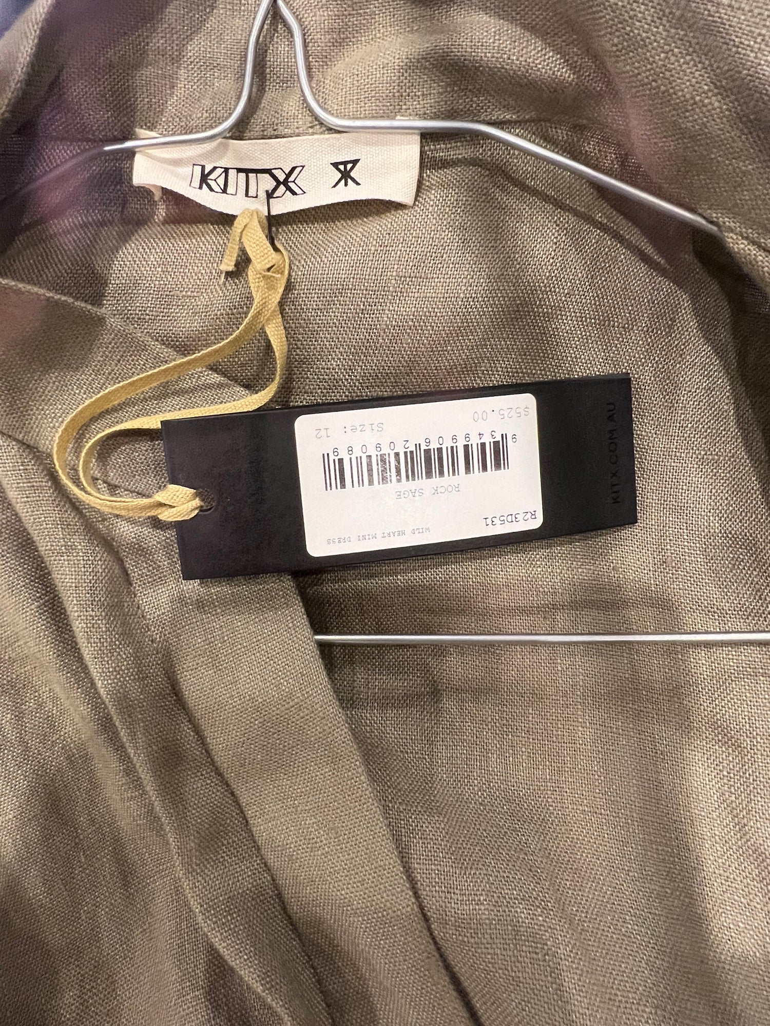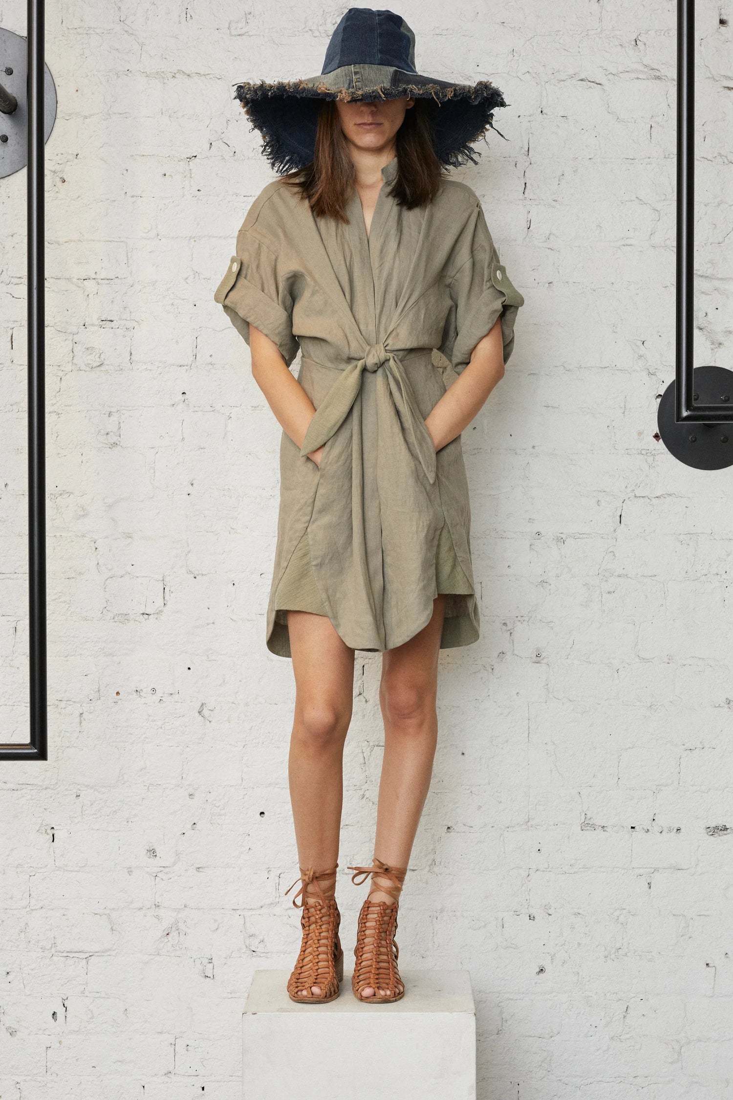 The Wild Heart Mini dress is made from 100% Linen. It features a deep V-neckline, closed with a concealed placket at centre front, and a cinched bust tie detailing. The hem is curved with a side gusset and is cinched back with elastic at the back waist.
