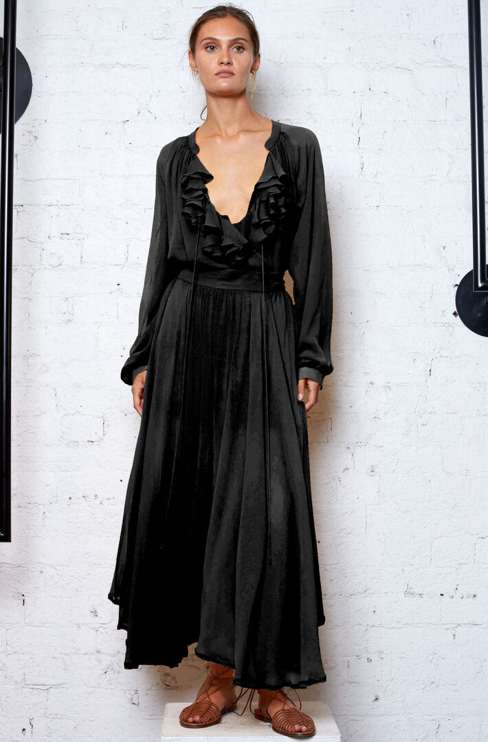 Silk georgette blouse with deep v ruffle neckline and an extended rouleau tie at the neck. Long, flowy sleeve with button at wrist. Crafted from silk georgette.