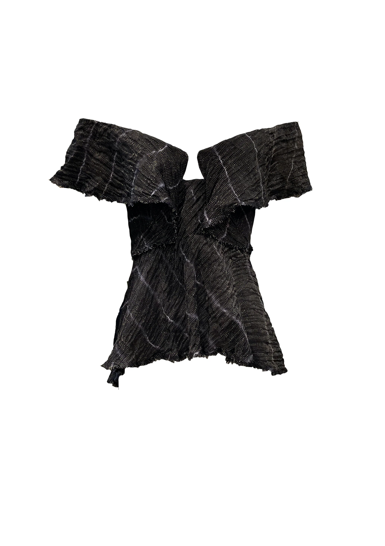 The X Corset Top in gold features a corseted bodice paired with an off-the-shoulder long-sleeve including sleeve split, and frilled hem for a softening summer look. This signature corset top is very flattering dress up with coordinating skirt or can be worn with shorts for a more casual cool look. Easy to get into with an exposed centre-back zipper. Crafted from linen.