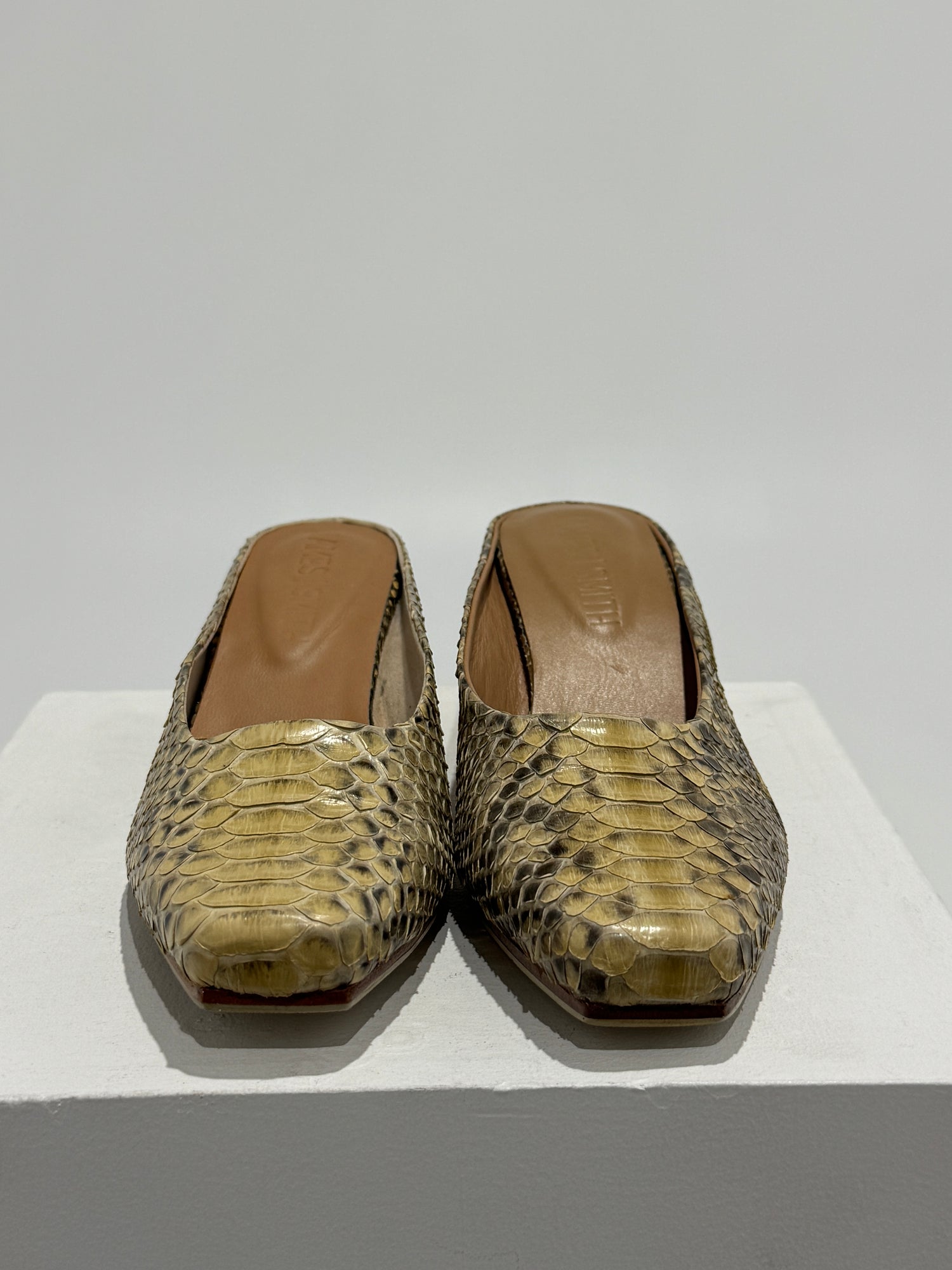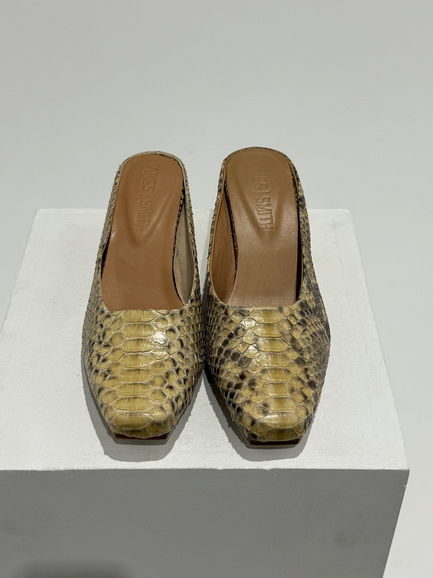 These Messina Mules from JAMES SMITH are next-level minimalism. The cream-and-beige snake-embossed leather upper has the prettiest gradient scales, while the squared toe keeps things modern. Flip them on for an instant style upgrade — the low, spherical wooden block heel adds a sculptural vibe that works just as well with jeans as it does with a midi dress.