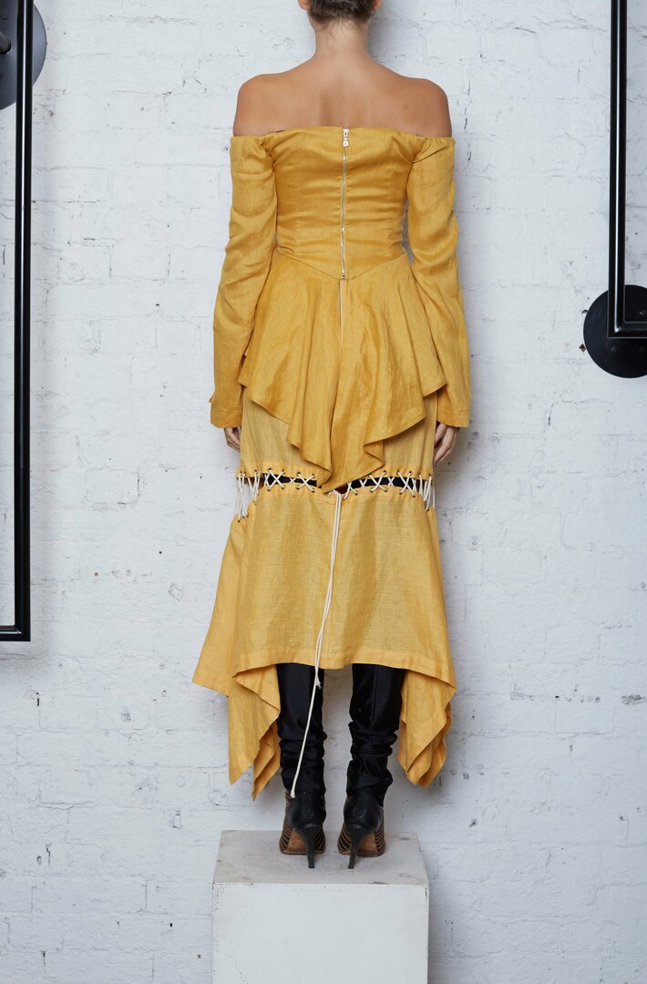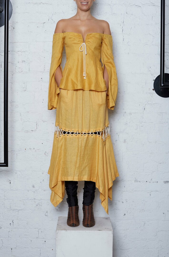 The X Corset Top in gold features a corseted bodice paired with an off-the-shoulder long-sleeve including sleeve split, and frilled hem for a softening summer look. This signature corset top is very flattering dress up with coordinating skirt or can be worn with shorts for a more casual cool look. Easy to get into with an exposed centre-back zipper. Crafted from linen. --- 100% Linen Made in Australia