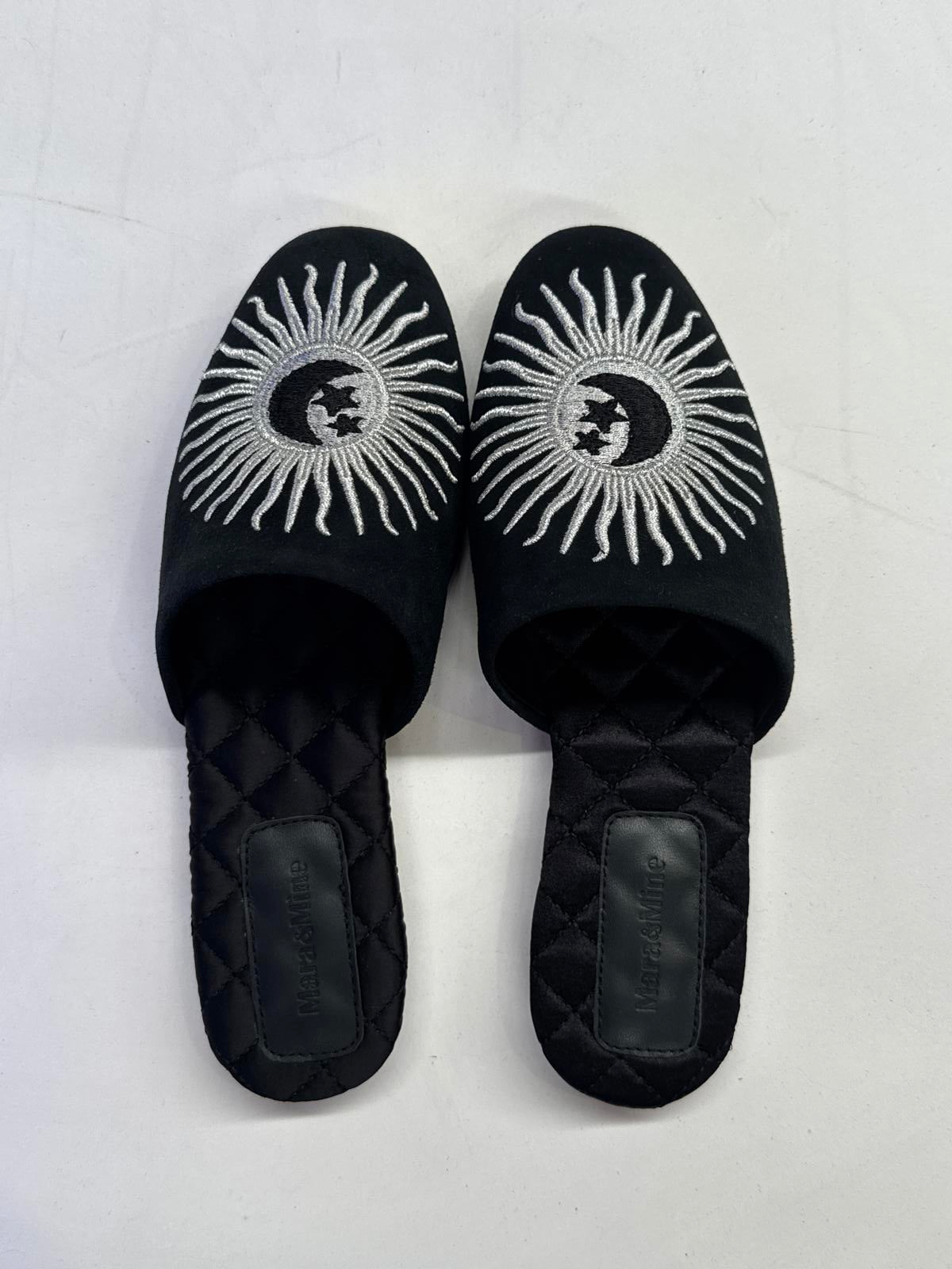 Elevate your lounging style with these chic black slide slippers featuring stunning sun and moon embroidery. Perfect for both indoor and outdoor wear, these slippers offer exceptional comfort and style. The quilted footbed provides extra cushioning, while the easy slip-on design ensures convenience. Whether you're relaxing at home or heading out, these stylish slippers will complement any outfit beautifully.