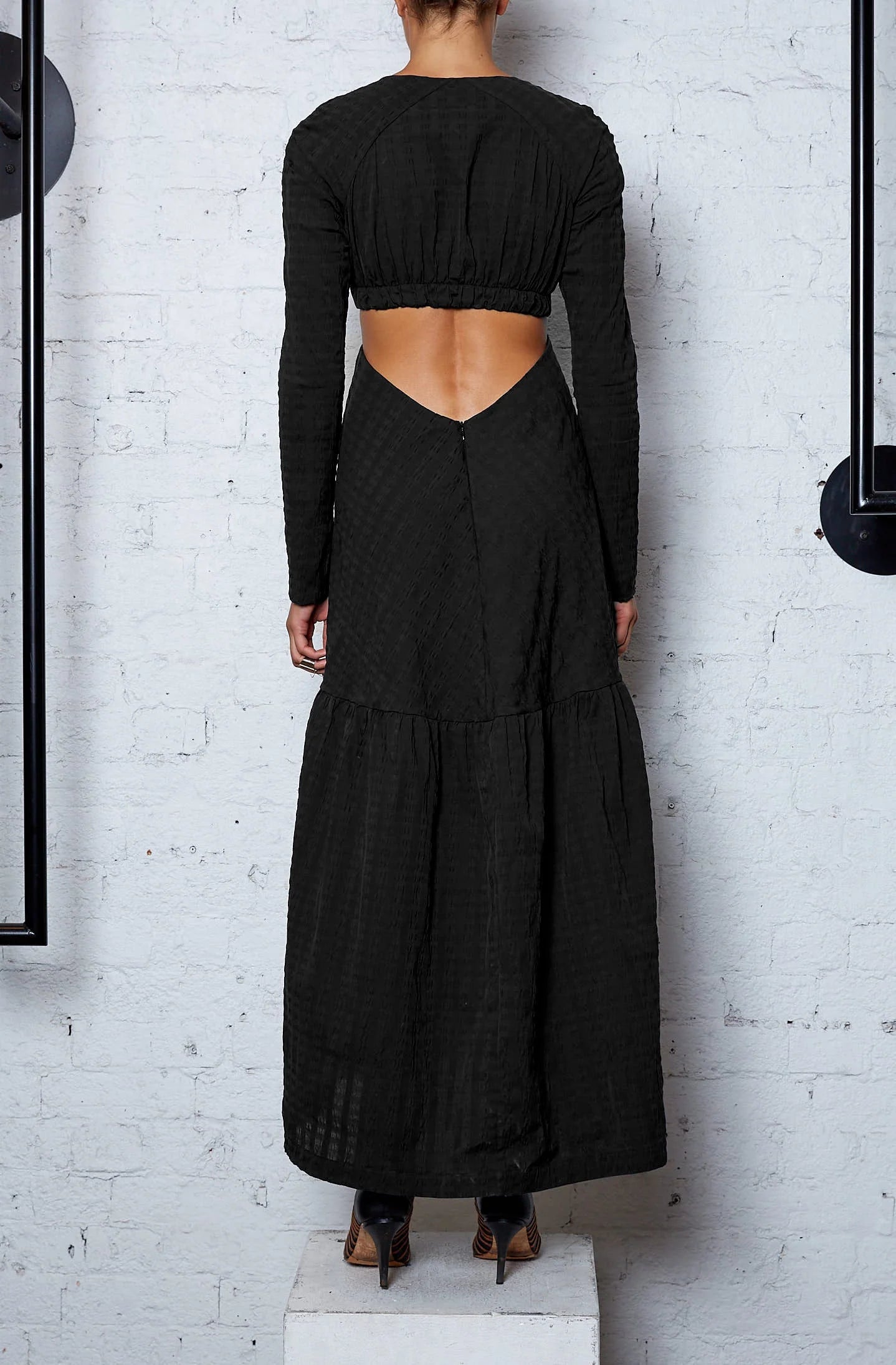 The Reviving Nature Dress in black is midi length, fitted through the hip with an elegant skirt that flares out with a ruffled hem, it is made in Australia from BCI cotton that has a little stretch. With chic fitted long sleeves and cut out detail at the back the dress has an invisible zip closure at centre back.
