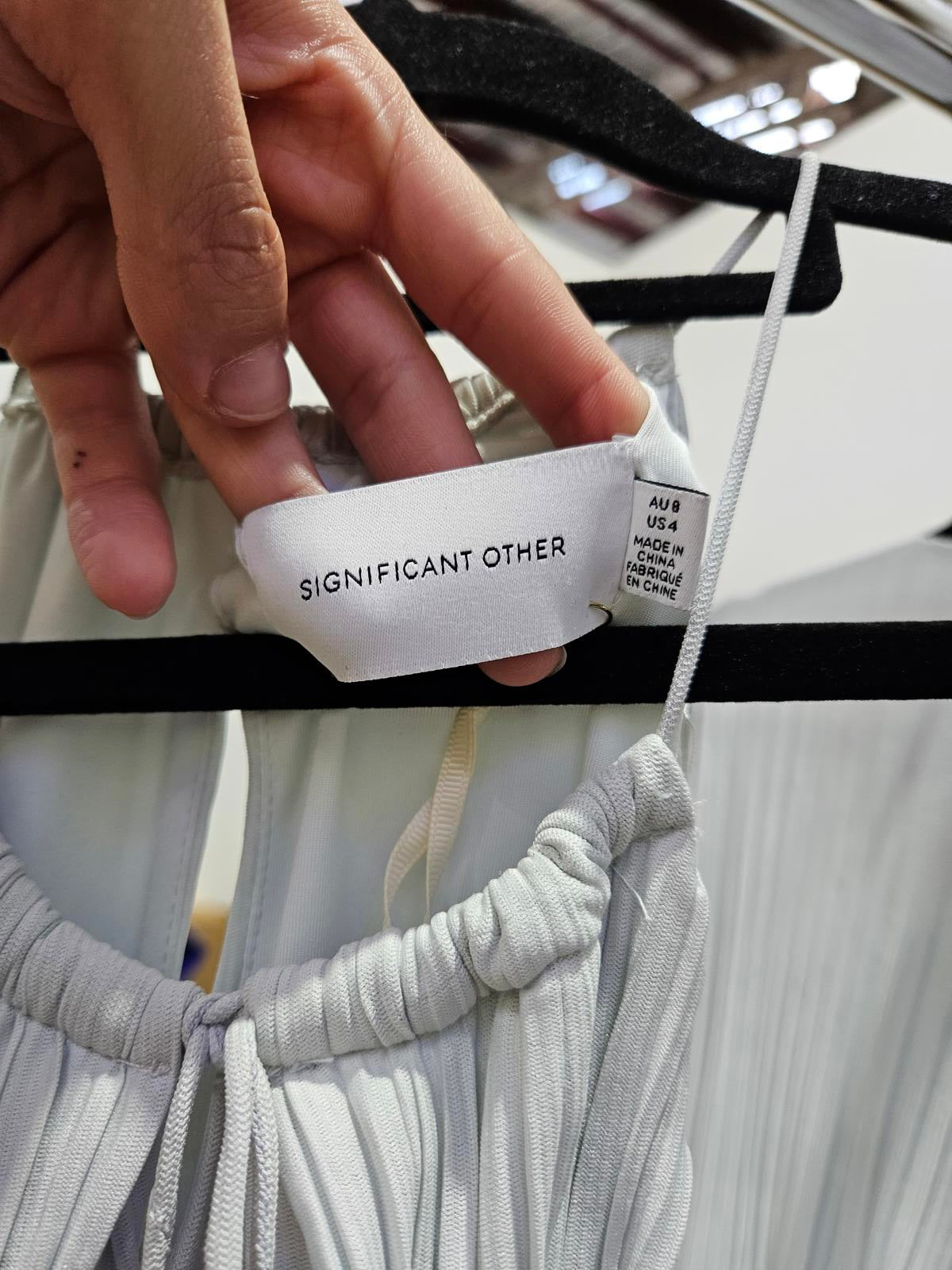 The Adeline Dress by Significant Other is cut from crinkle-finish polyester for a textured, feminine silhouette. It features a draped bust with centre-front tie, an elasticated waistband for shape, and elegant side splits for movement. Fully lined for comfort.