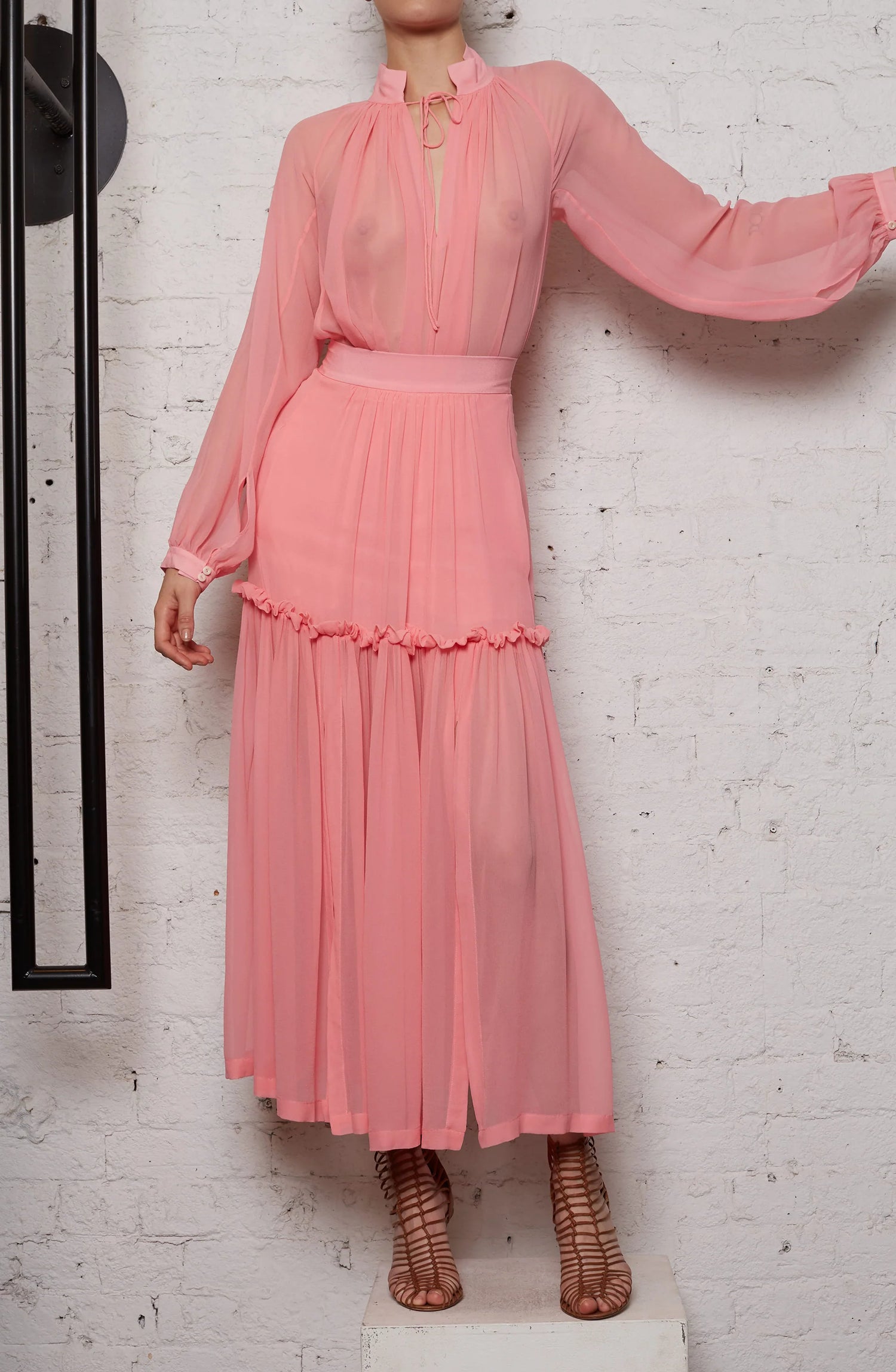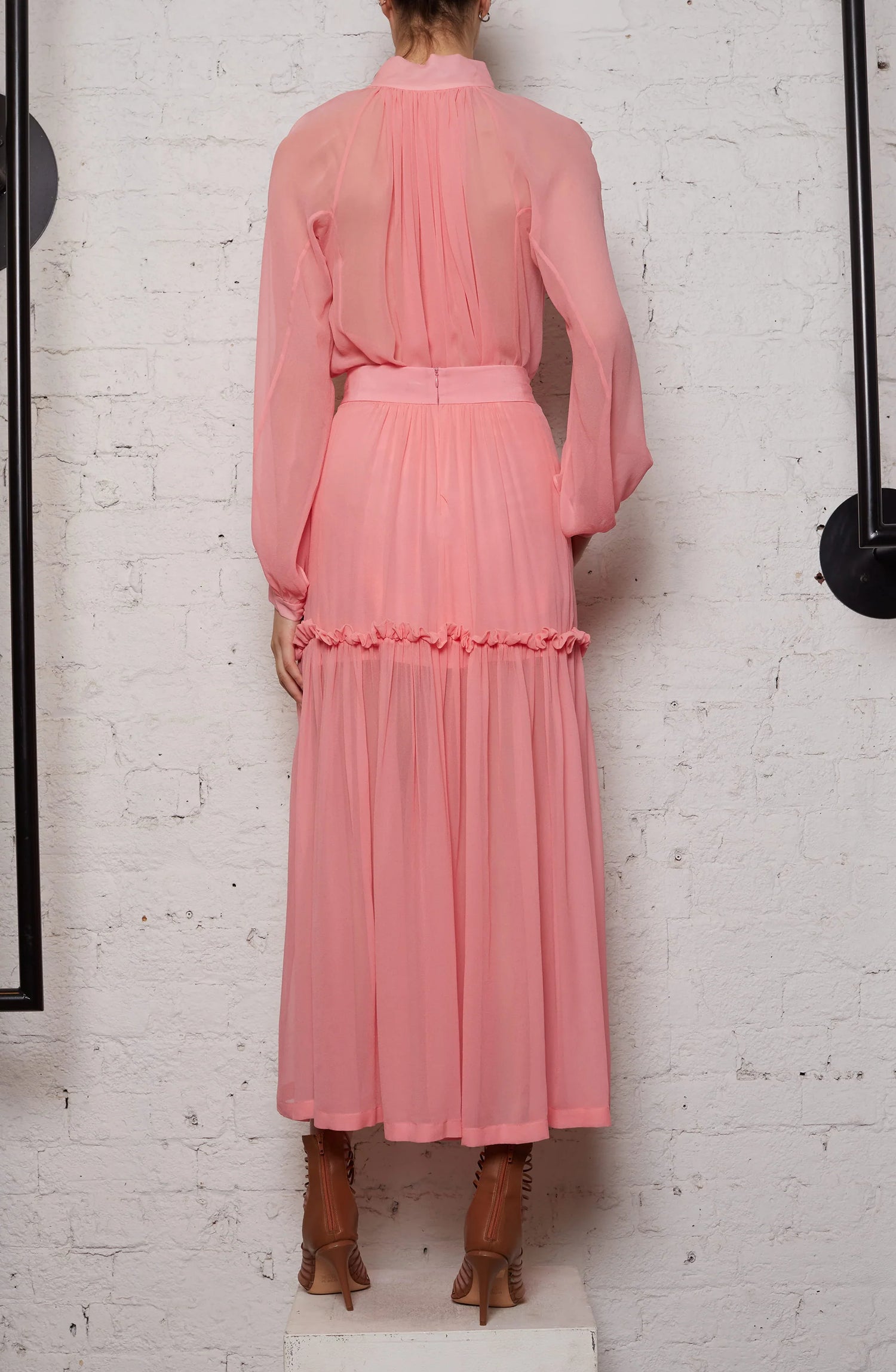 High-waist silk midi-skirt with picot edge detailing and zipper closure.